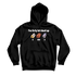- Black pullover hoodie with multi-color ink print