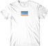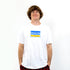 - White t-shirt with blue/yellow ink print on the front